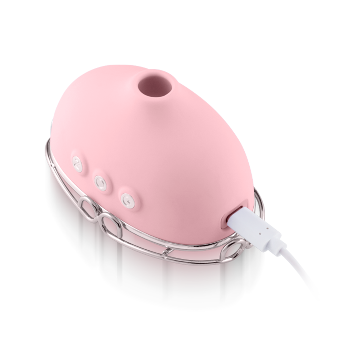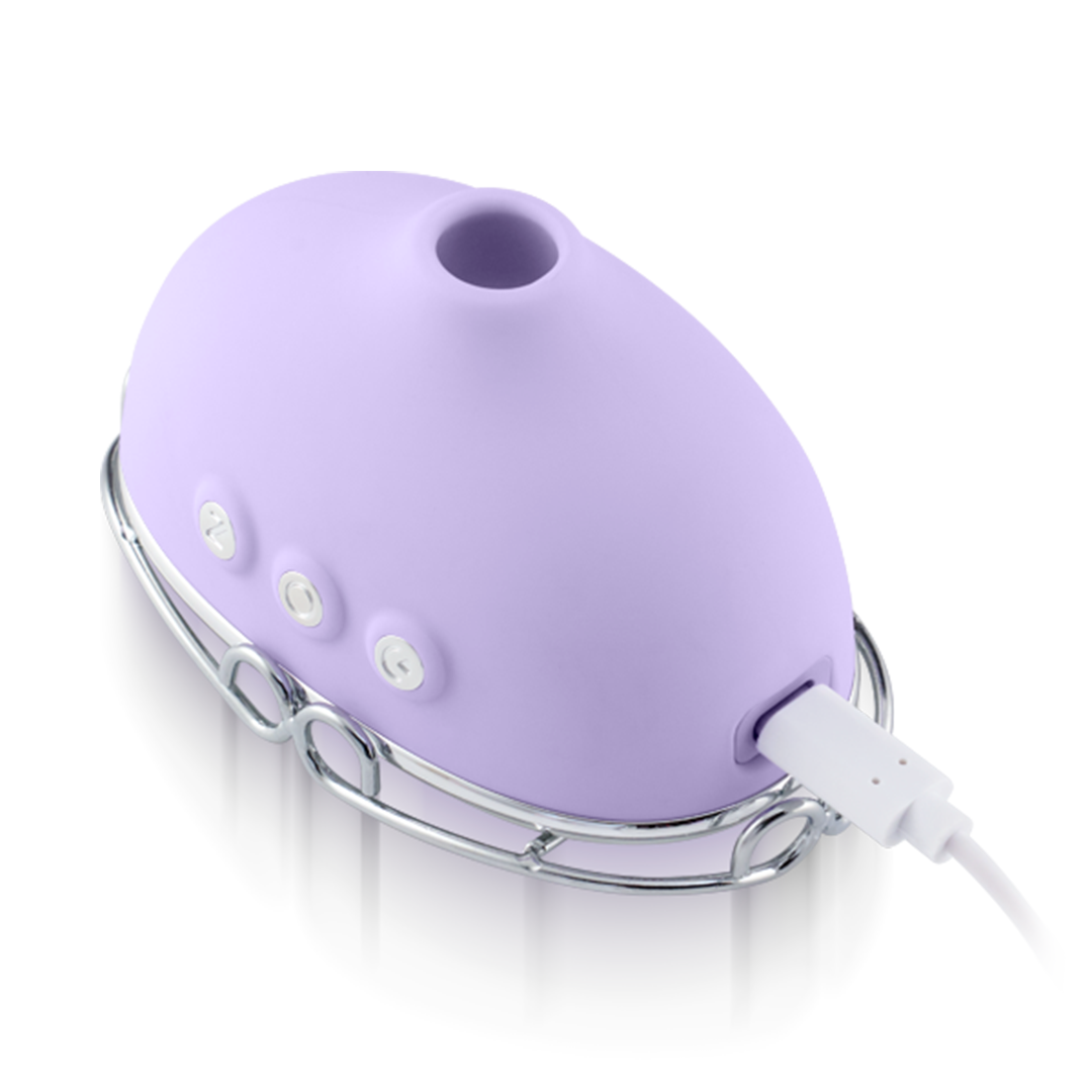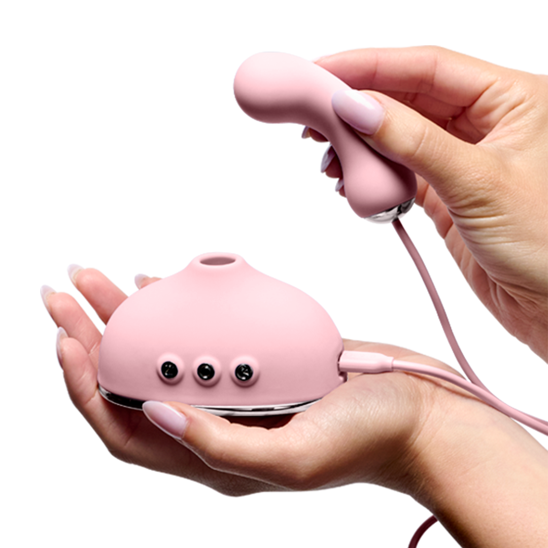 Off The Hook’s air chamber uses a pulsating motor to create pressure differentials when pressed up against your favorite spot, providing a suction-like sensation similar to oral favors.